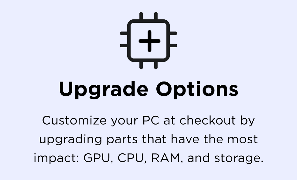 Player PCs are pre-configured for performance and fast shipping, however a few upgrades are available at checkout including more powerful CPUs, more RAM, or additional storage.